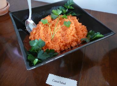 | To match a Russian Feast... Carrot Salad Salat "Zdorov'ye" known as 'health salad' in russia, it has almost enough garlic - I n g r e d i e n t s - Carrots - 2 pounds, about 16 medium-small carrots Lemon - 4 tsp, preferably Meir's lemons Garlic - 16 medium cloves, minced Mayonnaise - 1/3 cup of Best Foods Fat-Reduced mayonnaise Salt - to taste Parsley - to Garnish - T o o l s - Knife, Cutting Board, Grater, Citrus Juicer Large Mixing Bowl, Rubber Spatula, Measuring Cup & Spoons A brightly colored Serving Bowl & Serving Spoon - T h e B i g P i c t u r e - The Russians call this 'Health Salad' because they believe that carrots thicken the blood, which is an asset in the cold coldness of the North. I've never heard that carrots do thicken the blood (worse for a stroke), but I have heard that lemon juice thins the blood (avoiding a stroke), so all in all, I'm leaving it up to the garlic to contribute the health benefit. This is one of the few recipes that is not better made the day before. If you do, the garlic gets kinda strong and very slightly rank. But it's a fairly simple recipe so you can make it the morning of the feast. It should be refrigerated, but two or three hours will be enough. I make a French version of this salad with the same ratio of carrots to garlic, 1 to 1, but I dress it with very high quality olive oil, salt, a little sweetness if the carrots aren't naturally sweet, and a blend of vinegars: mostly rice wine, followed by red wine, and a little bit of balsamic. It is a great hit ! ( for those that love garlic ) - T h e A s s e m b e l a g e - The morning of, get the Carrots ready by cutting off the tops, peeling them, and washing. The original recipe calls for grating them, but if you have to do that by hand, good luck. I cut them lengthwise several times and use the cuisineart and shredding attachment. If you want to stay true to the recipe, then pulse them a few times with the blade until they have that grated look. Place them in the large mixing bowl and add the 4 teaspoons of fresh Lemon Juice while you are tossing the carrots. Then while still tossing, the 16 cloves of minced Garlic and like about a 1/4 teaspoon of salt (less than what your taste tells you). Mix in the 1/3 cup of Mayonnaise and taste again for salt. Make any adjustments, but only use the ingredients mentioned for adjustments. Transfer this to your serving bowl and chill covered in the refrigerator for whatever time you have left. Garnish with little sprigs of curly or flat parsley. - T o T h e A p p e t i z e r T a b l e - This is an easy one... open the refrigerator, get the bowl and serving spoon, and get thyself to a party. We would like to thank Darra Goldstein The author of At the Dacha, Russian Home Cooking This book is out of print, and it must be loved because it's hard to find used ones, but she has others. Go to Amazon.com and type in Darra Goldstein in the search box. We have adapted her recipes here and there, but done under the watchful eye of Andy Zaharoff. Next Page |