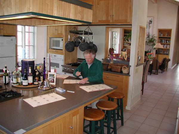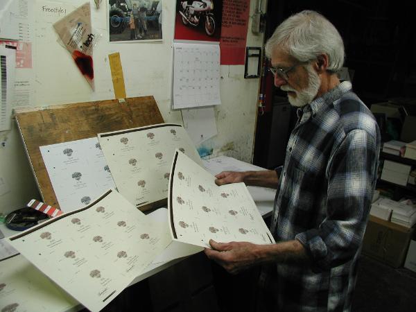 H o w we D r e s s t h e B o t t l e s Supposing somebody walked up to you and said, "you can have any face you want, so tell me, what face do you want?" That sort of shocking possibility is something like the feeling you get when you set off to design a wine package. So to create these 'faces' is to create a delicate balance of still being who you really are, and yet, having a few more people take notice than they did before. And of course faces have to be on bodies, so there is the next question, "you can have any body you want, so what will it be?" The face is the label and the bottle the body. So this is how it all took form, first the face: In the Spring of 2004, Krassimira and Bruce took a little trip to the City. When we arrived, we parked on the third story of a parking structure that lined us up with the top of an old Italian grocery store. At the time we didn't really see what was in front of us because our mission was to have lunch at one of those classic San Francisco restaurants, and after a very nice leisurely meal, we returned to the car. There we sat for a moment and looked out at what must have been the neighborhood grocery store. We were at the same elevation as the top of that building across the way, and it was fairly close. At the peak was an old painted illustration surrounded by a frieze. It had everything. Everything that inspired taking home those ingredients from the store and making an expression of love. And we both said, yeah, that's it, it should be something like that. Next Page So off to Petaluma with us where we met up with our favorite illustrator, Chuck Pyle. And after another lovely long lunch, we were quite sure that he had the vision too. The illustration was all drawn from words, we never handed him anything and said, make it look like that. Admittedly, if we could have done that it would have been easier on everyone, but Chuck would make a sketch and send it to us. Krassimira would make a sketch, and we would send it back. After a few of these exchanges we were getting really close. Close enough that it was time for us to get out of the way and let Chuck do his magic, which he did. Now we had the illustration, it is a sort of a 'family crest' for us. It has the important elements of how we put our family life together: vineyards on hillsides, the dining table, the campfire, energy coming out of the bottle, and curious angelic cherubs helping in the whole process. Then the process of putting the type around the illustration came next. I tried, but Chuck was kind enough to point us in the direction of a great graphic designer, Doug Offenbacher. So again, with a shared vision, the type was set. We included the elements that spoke to the way we evolve the wines: The vineyard is the most important, so it gets the biggest type. We make the wine barrel-by-barrel, bottle it the same way, so each barrel needs its own label and that is indicated accordingly. We stand by the product, every purchaser has to be a happy customer, so I sign the labels to let people know that my name and reputation is there. And of course there is the year of the vintage, and add further serialization by each bottle getting its recognition with a number of where it came in the birth order. Those are the elements. Then the labels need to be printed. The Sonoma Print shop got the honors. Printing can be such a touchy matter, after all, this is your face, right? We were lucky enough to have a great printer, Lloyd, who prints by the same adage we live by when we make wine, 'Assume Nothing'. So with checks and double checks the labels got printed. Furthering our luck, I was just bright enough to realize that it would be much easier to sign the labels if I did it while they were all on the same piece of paper; in other words, prior to the galleys being cut. So if you want to really twist your mind, try signing your name 2,800 times in the presence of ink vapors. Moving from the face to the body, we needed a bottle. Krassimira and I had noted on several occasions that really good bottles of Pinot Noir seemed to run out 250 milliliters too soon. So with enough empirical evidence to support our feelings, we decided to bottle in 1,000 milliliter bottles. To find a suitable 1 liter bottle was a tribulation. We thought we wanted a punted bottle, but when we got one, it was just too big. We didn't want it to look like a magnum, so now we needed to find a flat bottom one that was still the classic 'dead leaf green' color. Louise Otwell helped us out, and she was able to bring in the glass from Canada. The glass came all together, shrink wrapped on a pallet. So now we needed to have custom made boxes, and Kim Kelly used her skill to help us out there. Now the cork. Well, why not the best available? As much as I love to see New Zealand Sauvignon Blanc in a screw top finish, that wasn't going to work for our style of ceremony. So Nathalie Durham of M.A.Silva Corks helped us out also. It is absolutely amazing how many people it takes to create that little village that makes a home for our wine. And luckily, everybody was really good at what they do and did. And with face and body just what we wanted to create, our wine is all dressed up, and, it has some place lovely to go. & Our printer, Lloyd of the Sonoma Print Shop, examines the craftsmanship before the chop-chop of the galleys occurs. From one galley to the other galley, and yes chop-chop, hurry up. Bruce, in the kitchen of World Headquarters, is trying to get the last of the labels signed. He is undoubtedly wondering if this was such a good idea, given that it is St. Patrick's Day and the celebrating has already started. Next Page |