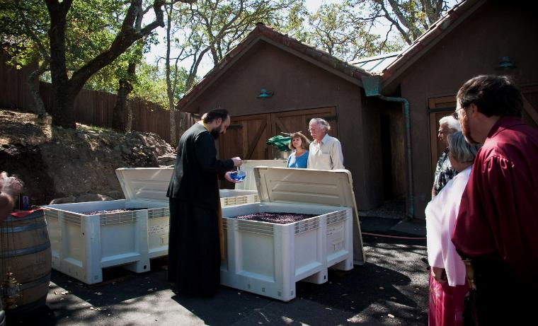 | The Blessing of the Fermenters... this is the kind of 'lab work' we like the best. I think we are so smitten with it because it gets results, but none of them with a number. It's true, we tend to be quite the minimalists when it comes to assigning certain wine characteristics, qualities and overall quality with a number. Numbers tend to make you believe that just one thing is true at a time. In the finest of winegrowing, many things are true at a given moment. And you have to juggle all of that stuff in your head and heart at once. So that is why we venture out to blessings, you just can't quantify them and you will never be able to prove that it 'did' anything. That's my cup of tea (or bowl of holy water). |