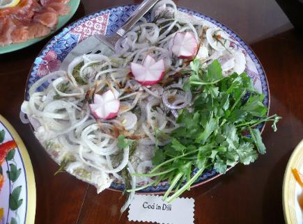 | To match a Russian Feast... Cod in Dill Marinade Paltus v Marinade S Ukropom dill is the perfume of russian cooking - nothing fishy about this one - I n g r e d i e n t s - Fish - 2 Pounds, Ling Cod, Red Rock Cod, or Halibut Salt - To taste Black Pepper - Freshly ground, to taste Onions - White or Yellow, 1 medium, sliced into very thin rings Garlic - 1 to 2 large cloves, peeled and minced Bay Leaf - 1 leaf Black Peppercorns - 8 corns Crushed Red Pepper Flakes - 1/4 tsp Mustard Seed - 1/8 tsp Fresh Dill - 2 tsp snipped Dill Pickle Brine - 4 cups from a jar of dill pickles Garnish - Lemon thinly sliced, minced Parsley, fresh Dill - T o o l s - Knife, Cutting Board, Measuring Cup and Spoons Large Baking Dish, Spatulas for turning and scraping A white Serving Plate - T h e B i g P i c t u r e - Now this is a great recipe if you are just about to finish up a large jar of dill pickles. The recipes calls for 4 cups of that brine. What if you don't have it? Improvise! Take these things and put them in your cuisinart: some dried dill, pickling spice, a clove of garlic, salt, and a dill pickle; pulse it a few time until the spices break up and add 3 1/2 Cups of water. Taste it and see how you did. If its not quite right, keep improvising. Strain it and use accordingly. This will be enough appetizer for 15+ people. - T h e F i s h B a k e - Wash your fish and lay it out so you can sprinkle it with Salt, and grind on Black Pepper. Preheat the oven to 350 F. Slice the 1 Onion into its thin rings, separate them, and mince the 1 to 2 cloves of garlic. Lightly oil the baking dish to fit your amount of fish. Place the fish in the baking dish and put all of the Bay Leaves, Black Peppercorns, Crushed Red Pepper, Mustard Seed, Fresh Dill, and then the onions and garlic evenly over the fish. Pour the dill pickle brine (or the reasonable facsimile) over all and cover the dish. Depending on the material of the baking dish, bring it to a simmer in the microwave, or over the stove top. Then put it into the oven. Oven-poach the fish for about 15 minutes, plus or minus, depending on the thickness and type of fish. Watch for the first flaking and promptly remove from the oven and keep covered. Cool the baking dish in a cookie sheet of water so the fish does not keep on cooking. When cool enough, put it into the refrigerator. - T o T h e A p p e t i z e r T a b l e - On the morning of, take the baking dish out of the refrigerator and get your serving plate ready. Take the fish out, leaving the marinade behind. Put it on the serving plate and cut it into bite-sized pieces, arranged appropriately. Start the garnishing with thinly sliced lemons, some under the pieces, and some in the voids. Put about washed and pretty sprigs of fresh dill, some tucked under, and some in the voids. Lastly, sprinkle finely minced curly parsley over it all. Loosely cover it with saran wrap and put it back into the refrigerator. Now tell me, can you imagine your first taste of vodka? We would like to thank Darra Goldstein The author of At the Dacha, Russian Home Cooking This book is out of print, and it must be loved because it's hard to find used ones, but she has others. Go to Amazon.com and type in Darra Goldstein in the search box. We have adapted her recipes here and there, but done under the watchful eye of Andy Zaharoff. Next Page |