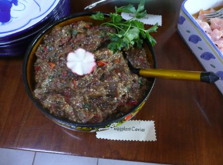 | To match a Russian Feast... Eggplant Caviar Baklazhannaya Ikra is there something wrong with me? i like this better than caviar - I n g r e d i e n t s - Eggplants - 3 small ones, less than 1 pound each Olive Oil - about 1/2 cup Onions - 2 medium yellow or white, finely chopped Green Bell Pepper - 1 finely chopped Garlic - 4 cloves, peeled and crushed Tomatoes - 3 fresh, blanched, peeled and finely chopped -or- 1 28-oz can of Plum Tomatoes, drained and finely chopped Honey - 1 generous tsp Salt - 1 Tbls Black Pepper - Freshly ground, to taste Cilantro - 1 Tbs, chopped Fresh Dill - 1 Tbs, chopped Lemon - 1 juiced - T o o l s - Knife, Cutting Board, Measuring Cup & Spoons Large Frying Pan with tight Cover, Spatulas for turning and scrapping A brightly colored Serving Bowl, Serving Spoon - T h e B i g P i c t u r e - This is the signature dish of a Russian appetizer table. It's also a holy-grail dish; this is the one where it's handed-down and people get a little bit touchy about changing the recipe. And yet this is the dish that Russians use to measure the skill of the cook, so you know that there are 'little secrets' in the ingredients that don't appear in the list (but I added two of them that Andy let me know about). To quote Darra Goldstein, explaining the Russian background: "For those unable to afford the luxury of fish roe (caviar) at their table, this finely chopped eggplant dish presents a tasty alternative -- hence its nickname 'poor man's caviar.' This spicy 'caviar' originated in the Caucasus and was adopted by the Russians into their own cuisine. It is best served on thick slices of black bread. Try to resist eating the caviar right away so the flavors can meld overnight in the refrigerator." There are thousands of ways to make this dish, it can even be made with summer squash. It can be made by just roasting all the ingredients and then pulsing them in the cuisneart. But, be that as it may, make the classic version (and that's a qualified statement) first, then make your own, get the knowing-nod of approval from a Russian, then teach it to a friend, and then become part of folklore. This will be enough appetizer for 20+ people. - T h e S a u t e a n d E g g p l a n t B a k e - The day before, wash the Eggplants and place them in a baking dish. Preheat the oven to 375 F and put in the eggplant for 45 minutes or until tender. Set them aside to cool. Sauté over medium heat the 2 onions. Give them a medium chop, and put them in the large frying pan with the half cup of Olive Oil, proceed until they are soft, but not browned. Then add the finely chopped green Bell Pepper and 4 cloves of Garlic to the pan, and continue sauteing until the bell pepper softens. Peel the cooled eggplant, chop the pulp finely, and add that to the pan. (Sometimes it's easier to scoop out the eggplant than to peel it.) Also add the 3 Tomatoes, or the ones from the 28 oz can, chopped. Season with the generous teaspoon of Honey, the Tablespoon of Salt, and Black Pepper to taste. If it doesn't seem balanced to you, adjust the taste with the honey and/or salt. Bring this whole mixture to a fast simmer/slow boil, then reduce the heat and let it slow simmer with the lid on for about 1 hour, stirring twice. After the hour is up, take off the lid and while you occasionally stir, continue to simmer until the excess liquid has evaporated but the mixture is not dry. This will take 30 to 45 minutes, depending on the consistency of the vegetables used. At this point, while it is still hot, add the juice of 1 fresh lemon, the Tablespoons of finely chopped Cilantro and Dill, and a liberal amount of fresh and finely ground Black Pepper. Taste, adjust, taste..... ? And you are ready to transfer it to your beautiful serving bowl and refrigerate covered overnight. - T o T h e A p p e t i z e r T a b l e - Take the bowl out, remember the serving spoon, and you are ready to party. We would like to thank Darra Goldstein The author of At the Dacha, Russian Home Cooking This book is out of print, and it must be loved because it's hard to find used ones, but she has others. Go to Amazon.com and type in Darra Goldstein in the search box. We have adapted her recipes here and there, but done under the watchful eye of Andy Zaharoff. Next Page |