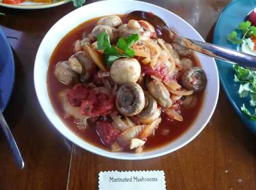 | To match a Russian Feast... Marinated Mushrooms Griby, Marinovannye v Tomatnom Souse no appetizer table can be complete without at least one mushroom dish - I n g r e d i e n t s - Mushrooms - 4 1/2 Pounds white button mushrooms, washed and trimmed Olive Oil - 1/2 cup, high quality Lemon - 6 Tbs of freshly squeezed juice, this will take 2 or 3 lemons Onion - 3 large Yellow or White, sliced Garlic - 5 to 7 cloves, crushed Black Pepper - 1 tsp, freshly ground Marjoram and Thyme - 3/4 tsp each, dried or fresh if you are growing it Bay Leaves - 4 Turkish bay leaves Tomatoes - 2 28-oz cans of plum tomatoes drained and chopped, reserve the juice Vinegar - 1 1/2 Cups high quality Red Wine vinegar Sweetener - 1 1/2 tsp Honey Hot Sauce - 1/4 tsp of a hot pepper sauce, could be Tabasco -or- Cayenne powder Salt - To taste Garnish - if desired - T o o l s - Knife, Cutting Board, Citrus Juicer, Large Mixing Bowl, Measuring Cups and Spoons Large Frying Pan with Cover, Spatulas for turning and scraping A Half-Gallon and a Quart Canning Jars with wide-mouths A beautiful, bright, multi-colored Serving Bowl and Spoon - T h e B i g P i c t u r e - This is best if done a week before, but you can do it a couple of days before the feast. These are rather central on the appetizer table, so if you find another interesting mushroom (Costco often has them) make a second batch with those, but don't mix varieties in the same batch. I do not suggest Crimini or Portabellas because they get too dark in color. Even though Russians are nuts about collecting them, Please, NO wild mushrooms. Yes I know they are so good, but.... - T h e M u s h r o o m S a u t é - At least 7 to 2 days before, wash and trim the mushrooms. Depending on the size of your frying pan, you will need to do the sauteing in batches. Of the 1/2 cup of Olive Oil total, put the appropriate fraction of it in the frying pan depending on your number of batches, and heat over medium+ heat. Sauté until just tender, but take them out before they start to shrink, this is important. Transfer them to the large mixing bowl, but do not add the expressed juice from the mushrooms. Use it for something else. Once transfered, toss with the 6 Tablespoons ( 2 oz ) of freshly squeezed Lemon Juice. Repeat the tossing for each batch added. Keep the mixing bowl in the refrigerator when you are not using it. - T h e R e s t o f t h e S a u t é - In the same large frying pan, heat the 6 Tablespoons of Olive Oil over medium+ heat. Finely chop your 3 large or 4 medium-small Onions. You can cut some into rings for visual variety. Crush 5 to 7 cloves of Garlic. Sauté the onions and garlic until they get soft, but not browned. Add the Black Pepper, 3/4 teaspoon each of Marjoram and Thyme, and the 4 Turkish Bay Leaves whole. Sauté a bit more, then add the 4+ cups of chopped Tomatoes from the 2 cans. Also add 3/4 cup of the reserved tomato juice, the 1 1/2 Cups of Red Wine Vinegar, 1 1/2 teaspoons of Honey, and 1/4 teaspoon of Hot Sauce or a scant 1/4 teaspoon of cayenne. It will seem like there is too much vinegar, but don't worry. Simmer covered over low heat for 25 minutes. Let cool and transfer to the large mixing bowl with the mushrooms. Toss, and transfer that to the tightly covered storage containers, something like a half-gallon jar and a 1 quart jar. Refrigerate for the 2 to 7 days before the feast. - T o T h e A p p e t i z e r T a b l e - On the morning of the feast, get out your container of mushrooms and transfer the mushrooms the whole mixture to a beautiful, multi-colored serving bowl. If you want to garnish with curly parsley around the edges, it will look nice. And a little flat parsley sprinkled on top of the mushrooms will give a little color. Add a slotted serving spoon and you will make quite a contribution to the feast. We would like to thank Darra Goldstein The author of At the Dacha, Russian Home Cooking This book is out of print, and it must be loved because it's hard to find used ones, but she has others. Go to Amazon.com and type in Darra Goldstein in the search box. We have adapted her recipes here and there, but done under the watchful eye of Andy Zaharoff. Krassimira Rector cooked this recipe and we thank her for the editing and corrections. Next Page |