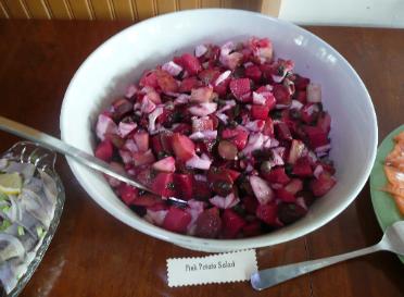 | To match a Russian Feast... Pink Potato Salad Vinegret iz Kartofelya i Svyokly yet another great variation on russian potato salad, in this case visually sensational - I n g r e d i e n t s - Potatoes - 4 pounds, small Yukons or Creamer style potatoes, organic if possible Beets - 2 smaller bunch beets Hard-boiled Eggs - 7, firmly boiled with the yolks discarded, chopped Cucumber - 2 conventional, or 1 large 'English' Cucumber, diced Dill Pickle - 1 cup diced Scallions - 7 stalks, including the green tops, chopped Capers - 2 heaping Tbls Olive Oil - 4 to 6 Tbls, very good quality Salt - 2 tsp Vinegar - 6 Tbls White Wine Vinegar -or- 7 Tbls Rice Wine Vinegar Black Pepper - Freshly ground to taste Dill - 1 tsp of dried Dill - T o o l s - Knife, Cutting Board, Potato Peeler, Soft rubber Spatula, Vegetable Brush Large and small mixing bowls, Measuring Cup & Spoons Large Pan with lid for boiling the Potatoes, Small one for the Eggs A nice Serving Bowl and Serving Spoon - T h e B i g P i c t u r e - Russian Potato Salad is about as varied as what people call Chili. Some include meat or fish, others use only mayonnaise instead of sour cream, still others have an oil base. This one is a festive version as the beets give an attractive pink glow to the potatoes. It might be a little much if served on its own, but on the appetizer table it will look great. This is better made the night before so the flavors have a little time to marry, it will be enough appetizer for 20+ people. - T h e B e e t s, E g g s a n d P o t a t o e s - The day before is the best time to get started on this salad. Starting with the Beets: cut off the root, stems, and stem area and peel them being careful not to stain everything. Cut them into small chunks and give them a 12 minute head start in the pot of boiling salted water, so they will be done when the potatoes are. Get the 7 Eggs started on their way to being hardboiled. I find that using heavily salted water for the simmering makes them easier to peel. Which is done by cracking them past that membrane just under the shell, and cooling them in cold water as soon as the eggs are done. Once peeled, break the egg in half and take out the yolks and discard them, compost them, or feed them to a pet. Coarsely chop the Egg Whites and put them in the large mixing bowl. Store the bowl in the refrigerator when you are not using it. Regarding the Potatoes: 4 pounds of smallish potatoes will measure between 12 and 14 cups of raw potatoes, depending on their size. Using your sensibilities, decide to peel or not to peel. If they are green under the skins, then they must be peeled because that green part is not good for you. I like to use thin-skinned, scrubbed, organic potatoes and I only peel the funky looking parts. I also like to coarsely chop the potatoes to the finished size before cooking so the doneness is easier to control during the gentle boiling. Put the potatoes in the large pot that already has the beets in it. If you forgot to salt the water, do it now, it should be like ocean water. Everything should be just covered with water. Gently boil them until they are at the first stage of tenderness. The redness from the beets will transfer to the potatoes, which is what you want. If you over-cooked them, rinse them in a colander under cold water to get them to stop cooking. Otherwise, drain the pot and put the potatoes and beets into the large mixing bowl. - T h e C u c u m b e r s, H e r b s a n d O i l - Peel and dice the cucumber/s and add to the large mixing bowl. Now in a smaller mixing bowl, mix the other ingredients. This will make it such that the tender vegetables will not get over mixed and turn into muck. To the small mixing bowl, add 1 cup of diced dill pickle, as well as the 7 chopped Scallions (green onions), including most of the green tops. Add 2 heaping Tablespoons of Capers from a jar, add 4 Tablespoons of high quality Olive Oil and the Vinegar of your choice, I favor the unseasoned Rice Wine Vinegar, the seasoned stuff has salt and sugar. 2 teaspoons of Salt, several twists of Fresh Ground Black Pepper to taste, 1 teaspoon dried dill, not fresh dill. Mix all of this together until well blended. Then gently mix into the large mixing bowl with a soft rubber spatula being sure to coat every part of the rest of the salad. If you think the salad is too dry, you can add the last 2 Tablespoons of high quality Olive Oil. Also when you taste it initially, it is just fine to think "Oh, there's a little too much vinegar", this is what you want because it will tame down by the next day. Chill the mixing bowl covered overnight. - T o T h e A p p e t i z e r T a b l e - In the morning, transfer the salad to a beautiful white serving bowl, this sets off the pink nicely. Before you transfer it, taste and make sure everything is right. This is your last chance to make adjustments. Cover with Saran Wrap and start thinking about what toasts you want to make... the party awaits. We would like to thank Darra Goldstein The author of At the Dacha, Russian Home Cooking This book is out of print, and it must be loved because it's hard to find used ones, but she has others. Go to Amazon.com and type in Darra Goldstein in the search box. We have adapted her recipes here and there, but done under the watchful eye of Andy Zaharoff. Next Page |