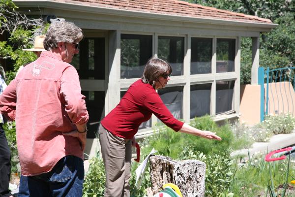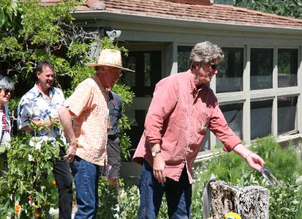 | Just to make sure there were no boobie traps or practical jokes, the gentleman went first. Emily, Andy, and Bruce watch the first pitch in what was almost the World's First Horseshoe Golf Tournament. Our noble judge of the Cinco de Mayo Burrito Roll-Up and Cook-Off, Pat Moran, makes the first male pitch. |